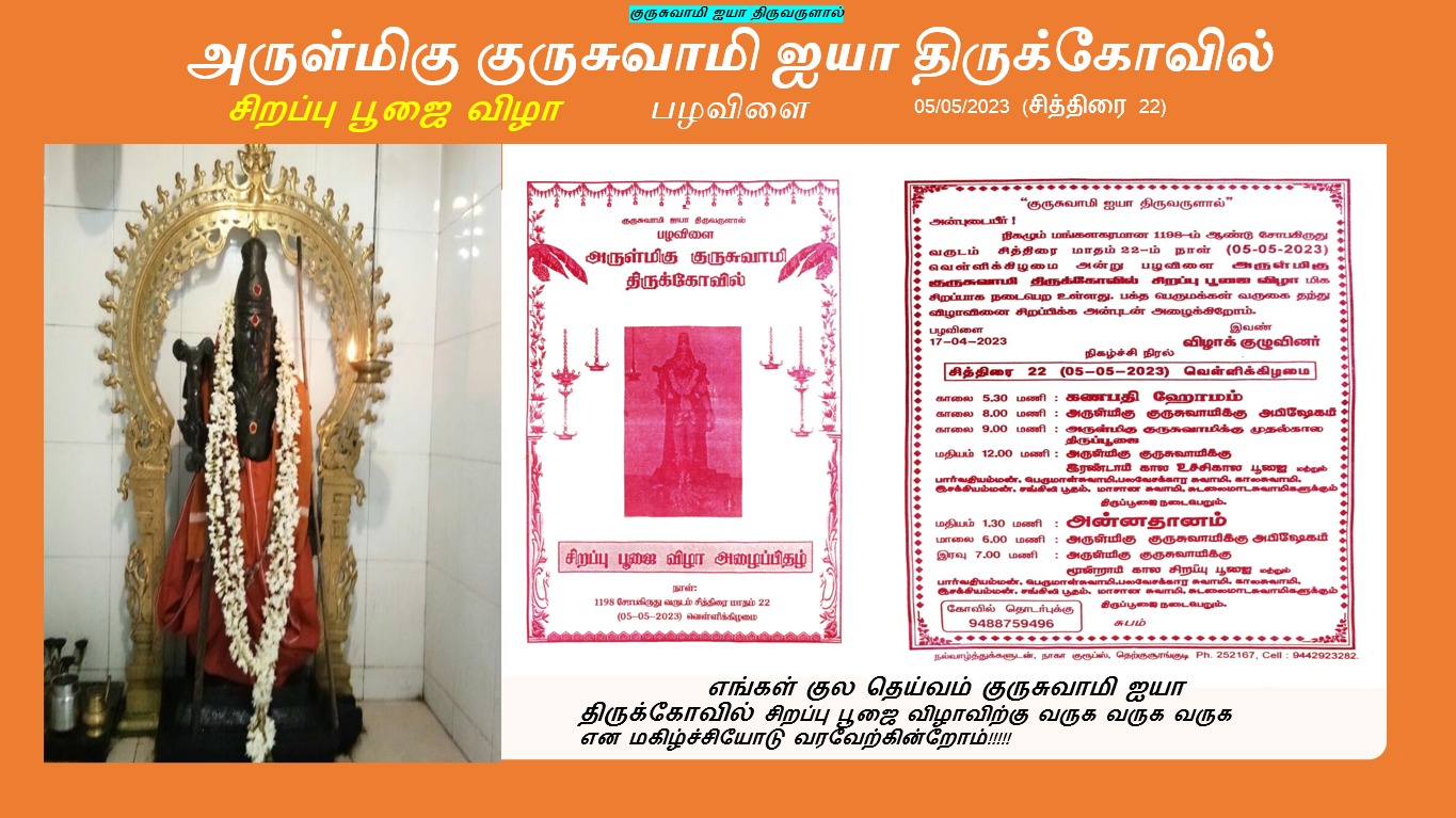 ” குருசாமி ஐயா திருவருளால் “ அன்புடையீர்! நிகழும் மங்களகரமான 1198-ம் ஆண்டு சோபகிருது வருடம் சித்திரை மாதம் 22-ம் நாள் (05-05-2023) வெள்ளிக்கிழமை அன்று பழவிளை அருள்மிகு குருசுவாமி திருக்கோவில் சிறப்பு பூஜை விழா மிக சிறப்பாக நடைபெற உள்ளது. பக்த பெருமக்கள் வருகை தந்து விழாவினை சிறப்பிக்க அன்புடன் அழைக்கிறோம். நிகழ்ச்சி நிரல் சித்திரை 22 (05-05-2023) வெள்ளிக்கிழமை காலை 5.30 மணி : கணபதி ஹோமம் காலை 8.00 மணி : அருள்மிகு குருசுவாமிக்கு அபிஷேகம் காலை 9.00 மணி : அருள்மிகு குருசுவாமிக்கு முதல்கால திருப்பூஜை மதியம் 12.00 மணி : அருள்மிகு குருசுவாமிக்கு இரண்டாம் கால உச்சிகால பூஜை மற்றும் பார்வதியம்மன், பெருமாள்சுவாமி,பலவேசக்கார சுவாமி, காலசுவாமி, இசக்கியம்மன், சங்கிலி பூதம், மாசான சுவாமி, சுடலைமாடசுவாமிகளுக்கும் திருப்பூஜை நடைபெறும். மதியம் 1.30 மணி : அன்னதானம் மாலை 6.00 மணி : அருள்மிகு குருசுவாமிக்கு அபிஷேகம் இரவு 7.00 மணி : அருள்மிகு குருசுவாமிக்கு மூன்றாமி கால சிறப்பு பூஜை மற்றும் பார்வதியம்மன், பெருமாள்சுவாமி,பலவேசக்கார சுவாமி, காலசுவாமி, இசக்கியம்மன், சங்கிலி பூதம். மாசான சுவாமி, சுடலைமாடசுவாமிகளுக்கும் திருப்பூஜை நடைபெறும். சுபம் கோவில் தொடர்புக்கு 9488759496 Post Views: 962
